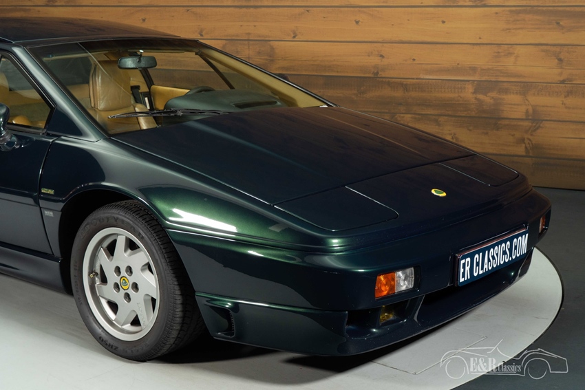 Donkergroen metallic Lotus Esprit Turbo SE te koop Het exterieur is uitgevoerd in een stijlvol donkergroen metallic lakwerk dat perfect past bij de strakke, tijdloze lijnen van de Esprit. De originele lichtmetalen velgen en de sportieve details zoals de Remus sportuitlaat en achterspoiler geven de auto een krachtige uitstraling. Het glazen kanteldak zorgt bovendien voor extra rijbeleving en lichtinval. Binnenin treft u een fraai tan-kleurig lederen interieur dat een prachtig contrast vormt met het diepe groen van de carrosserie. De klassieke analoge instrumenten en het karakteristieke dashboard versterken het authentieke jaren ’90 sportwagengevoel, terwijl de lage zitpositie en cockpit-achtige indeling zorgen voor een pure en betrokken rijervaring.