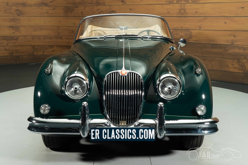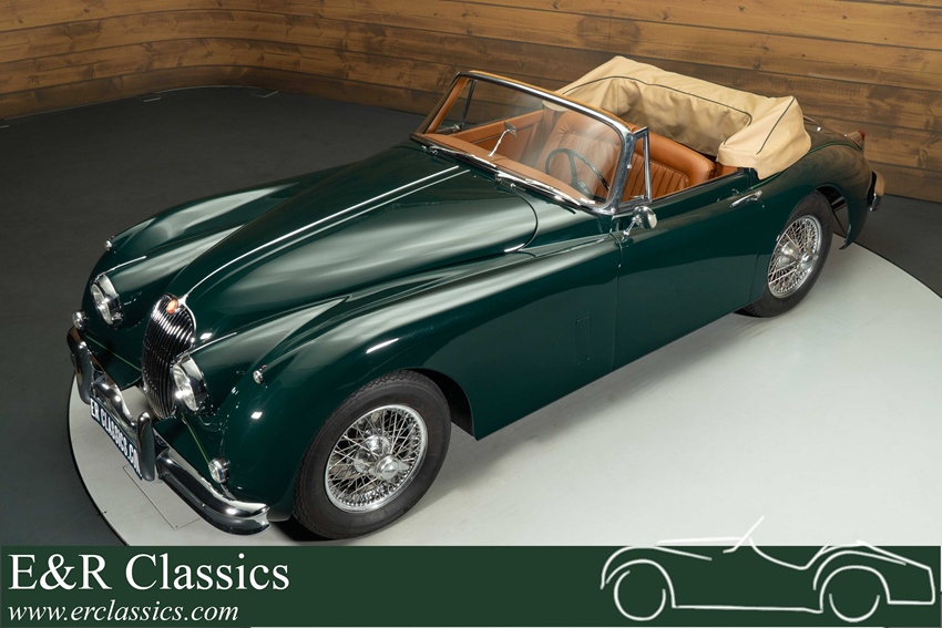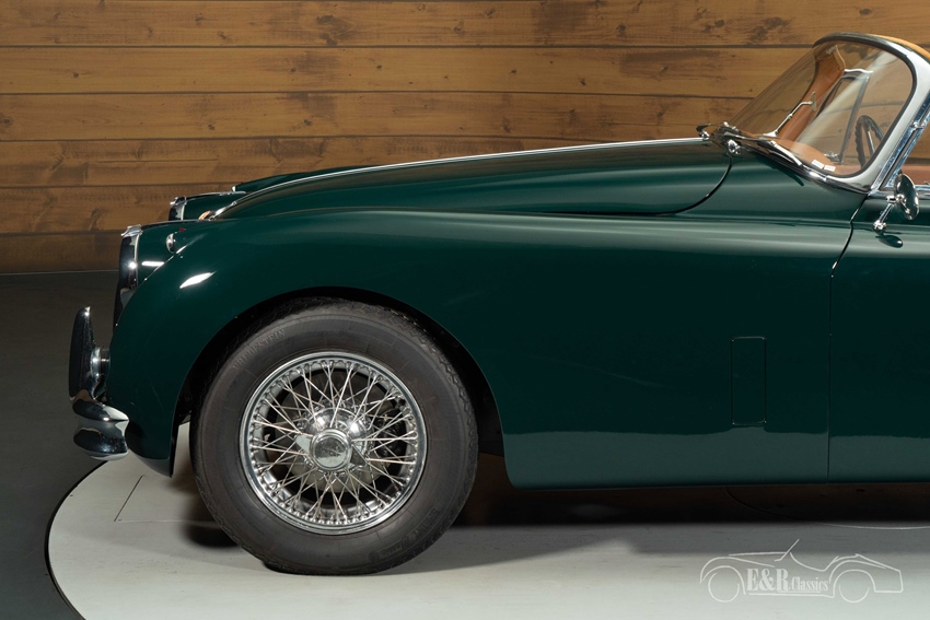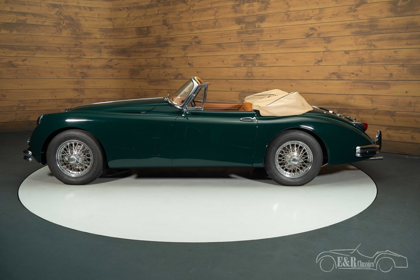 Jaguar XK150 Cabriolet in British Racing Green te koop Het exterieur is uitgevoerd in het iconische British Racing Green lakwerk, dat prachtig contrasteert met de beige soft top en de klassieke chromen spaakwielen. De elegante lijnen en verfijnde details geven de auto een tijdloze uitstraling, zowel met gesloten als open dak. Het interieur is afgewerkt in stijlvol cinnamon bruin leder, dat een warme en luxe sfeer creëert en perfect harmonieert met het diepe groen van de carrosserie. De hoogwaardige afwerking, het klassieke dashboard en de comfortabele zitpositie maken elke rit tot een bijzondere ervaring, geheel in lijn met het karakter van deze Britse klassieker.