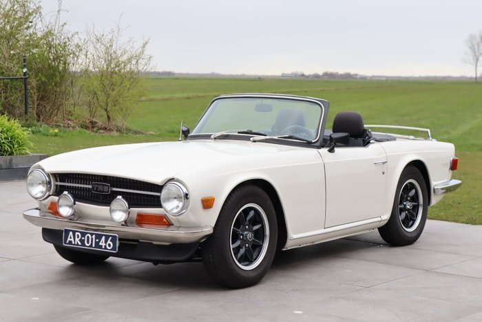 Triumph TR6 Overdrive Roadster 1970 - Professioneel body-off gerestaureerd - Nooit aan gelast! Origineel plaatwerk - Motor en versnellingsbak gereviseerd - Gebroken wit lakwerk met zwart skai-lederen interieur - Voorzien van modernere stoelen met hoofdsteunen en gordels, originele stoelen aanwezig - Vele technische verbeteringen - Roestvrijstalen uitlaat en 123-ontsteking - Uitvoerige documentatie aanwezig (handboeken, historie en onderhoudsfacturen) HISTORIE/DOCUMENTATIE Deze Triumph TR6 is zoals de meeste exemplaren nieuw geleverd in het zonnige klimaat van de Verenigde Staten, en wel door British Leyland Motors San Fransisco op 20 januari 1970. In 2010 is hij van Californië geëxporteerd naar Nederland, waar de huidige eigenaar de auto uitvoerig en professioneel heeft gerestaureerd. Het is aannemelijk dat de Triumph Californië nooit heeft verlaten, want aan de auto hoefde geen laswerk verricht te worden: het betreft hier een zeer harde en roestvrije auto met zeer fraaie passingen van carrosseriedelen. Bij de Triumph is een map vol documentatie aanwezig waaronder handboeken, onderhoudsfacturen, registratiepapieren en zelfs het originele Amerikaanse handboek. Het Heritage Trust certificaat weergeeft de originele status en levering van de auto. In 2022 is de TR6 getaxeerd op een waarde van € 34.000,- en wordt de auto als kwaliteitsklasse 1 geverifieerd; "uitmuntende professioneel gerestaureerde staat". De auto is uitgevoerd met Overdrive (soort 5e versnelling). De Triumph liefhebber herkent het exemplaar wellicht aan de foto van de auto die is gebruikt op de cover van het magazine Triumph Tribune (2023). EXTERIEUR Werkelijk een plaatje om te zien: het prachtige lijnenspel van de TR6 in de fraaie gebroken witte kleur (gespoten in 2019). Zowel het lakwerk als het chroomwerk, rubbers en verlichting: alles verkeert in een zeer goede en frisse staat. De zwarte vinyl softtop verkeert in goede staat en kan worden opgeborgen onder een kleine of grote tonneaucover. Aan de voorzijde zijn Lucas verstralers gemonteerd. In de spatborden zijn kunststof beschermkappen gemonteerd tegen vuilophoping. Aan de achterzijde is een bagagerek gemonteerd. De originele kofferklep zonder bagagerek is bij de auto aanwezig. Het plaatwerk van de auto is origineel, schadevrij en de passingen zijn kloppend. Er zijn fraaie lichtmetalen Minilite 15" velgen gemonteerd, die zijn uitgevoerd in zwart. De banden zijn nog voorzien van voldoende profiel. INTERIEUR Het interieur verkeert in een goede staat en is voorzien van enkele verbeteringen. Denk hierbij aan comfortabele Mazda MX5 stoelen met hoofdsteunen. De originele skai-lederen stoelen zijn bij de auto aanwezig en verkeren eveneens in goede staat zonder scheuren. Het dashboard is fraai afgewerkt met kersen-houtwerk. De deurpanelen zijn met zwart vinyl bekleed. De Smiths instrumenten zijn gekalibreerd en functioneren naar behoren. Het interieur beschikt over origineel geleverde en optionele verwarming, een gelaagde voorruit en een stuurslot. Later zijn 3-punts rolgordels, extra oplaadpunten (USB en 12V) en een hoofdstroomschakelaar aangebracht. Ook is een extra stuurslot bijgeleverd (anti-diefstal).Ook de kofferruimte is netjes en biedt onder de dubbele bodem plaats aan het reservewiel. Tevens is de originele krik aanwezig. TECHNISCH Ook technisch is de Triumph grondig aangepakt: de originele motor, versnellingsbak met J-type overdrive en differentieel zijn gereviseerd. De cilinderkop is loodvrij gemaakt en de compressieverhouding is op Europees niveau gebracht door de kop de vlakken. Tevens is 123-ontsteking ingebouwd in de standaard behuizing. Er is een high-torque startmotor, Sachs koppeling, aluminium radiateur, modern luchtfilter naast de radiateur (uitwasbaar) en een roestvrijstalen (sport)uitlaat gemonteerd. Dit zorgt voor een prachtig geluid uit de 2498 cc 6-cilinder lijnmotor. De motorruimte is schoon en is een lust voor het oog: hier is te zien dat kosten noch moeite gespaard zijn. Het chassis is schadevrij waar zover waarneembaar nooit aan gelast is. Foto's van de fraai uitziende onderzijde zijn te zien in onze fotoreportage. Uitgebreide documentatie van de restauratie en de motorrevisie is aanwezig. De remschijven zijn vervangen door verbeterde exemplaren en er zijn Hawk remblokken aangebracht. De handrembediening is verbeterd en er is siliconen remvloeistof aangebracht. Aan de voorzijde zijn instelbare schokdempers van GAZ gemonteerd. Aan de achterzijde zijn de schokdempers uitgevoerd in een conversiekit van Bastuck en voorzien van Koni dempers. De auto rijdt fantastisch: starten, schakelen en remmen gaat allemaal meer dan soepel en naar behoren.