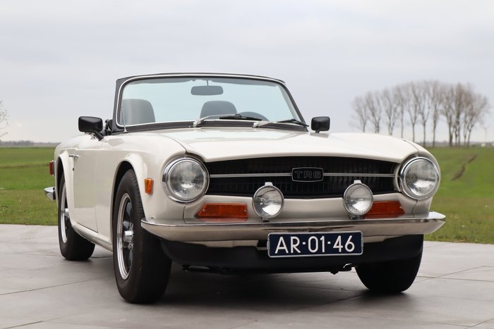 Triumph TR6 Overdrive Roadster 1970 - Professioneel body-off gerestaureerd - Nooit aan gelast! Origineel plaatwerk - Motor en versnellingsbak gereviseerd - Gebroken wit lakwerk met zwart skai-lederen interieur - Voorzien van modernere stoelen met hoofdsteunen en gordels, originele stoelen aanwezig - Vele technische verbeteringen - Roestvrijstalen uitlaat en 123-ontsteking - Uitvoerige documentatie aanwezig (handboeken, historie en onderhoudsfacturen) HISTORIE/DOCUMENTATIE Deze Triumph TR6 is zoals de meeste exemplaren nieuw geleverd in het zonnige klimaat van de Verenigde Staten, en wel door British Leyland Motors San Fransisco op 20 januari 1970. In 2010 is hij van Californië geëxporteerd naar Nederland, waar de huidige eigenaar de auto uitvoerig en professioneel heeft gerestaureerd. Het is aannemelijk dat de Triumph Californië nooit heeft verlaten, want aan de auto hoefde geen laswerk verricht te worden: het betreft hier een zeer harde en roestvrije auto met zeer fraaie passingen van carrosseriedelen. Bij de Triumph is een map vol documentatie aanwezig waaronder handboeken, onderhoudsfacturen, registratiepapieren en zelfs het originele Amerikaanse handboek. Het Heritage Trust certificaat weergeeft de originele status en levering van de auto. In 2022 is de TR6 getaxeerd op een waarde van € 34.000,- en wordt de auto als kwaliteitsklasse 1 geverifieerd; "uitmuntende professioneel gerestaureerde staat". De auto is uitgevoerd met Overdrive (soort 5e versnelling). De Triumph liefhebber herkent het exemplaar wellicht aan de foto van de auto die is gebruikt op de cover van het magazine Triumph Tribune (2023). EXTERIEUR Werkelijk een plaatje om te zien: het prachtige lijnenspel van de TR6 in de fraaie gebroken witte kleur (gespoten in 2019). Zowel het lakwerk als het chroomwerk, rubbers en verlichting: alles verkeert in een zeer goede en frisse staat. De zwarte vinyl softtop verkeert in goede staat en kan worden opgeborgen onder een kleine of grote tonneaucover. Aan de voorzijde zijn Lucas verstralers gemonteerd. In de spatborden zijn kunststof beschermkappen gemonteerd tegen vuilophoping. Aan de achterzijde is een bagagerek gemonteerd. De originele kofferklep zonder bagagerek is bij de auto aanwezig. Het plaatwerk van de auto is origineel, schadevrij en de passingen zijn kloppend. Er zijn fraaie lichtmetalen Minilite 15" velgen gemonteerd, die zijn uitgevoerd in zwart. De banden zijn nog voorzien van voldoende profiel. INTERIEUR Het interieur verkeert in een goede staat en is voorzien van enkele verbeteringen. Denk hierbij aan comfortabele Mazda MX5 stoelen met hoofdsteunen. De originele skai-lederen stoelen zijn bij de auto aanwezig en verkeren eveneens in goede staat zonder scheuren. Het dashboard is fraai afgewerkt met kersen-houtwerk. De deurpanelen zijn met zwart vinyl bekleed. De Smiths instrumenten zijn gekalibreerd en functioneren naar behoren. Het interieur beschikt over origineel geleverde en optionele verwarming, een gelaagde voorruit en een stuurslot. Later zijn 3-punts rolgordels, extra oplaadpunten (USB en 12V) en een hoofdstroomschakelaar aangebracht. Ook is een extra stuurslot bijgeleverd (anti-diefstal).Ook de kofferruimte is netjes en biedt onder de dubbele bodem plaats aan het reservewiel. Tevens is de originele krik aanwezig. TECHNISCH Ook technisch is de Triumph grondig aangepakt: de originele motor, versnellingsbak met J-type overdrive en differentieel zijn gereviseerd. De cilinderkop is loodvrij gemaakt en de compressieverhouding is op Europees niveau gebracht door de kop de vlakken. Tevens is 123-ontsteking ingebouwd in de standaard behuizing. Er is een high-torque startmotor, Sachs koppeling, aluminium radiateur, modern luchtfilter naast de radiateur (uitwasbaar) en een roestvrijstalen (sport)uitlaat gemonteerd. Dit zorgt voor een prachtig geluid uit de 2498 cc 6-cilinder lijnmotor. De motorruimte is schoon en is een lust voor het oog: hier is te zien dat kosten noch moeite gespaard zijn. Het chassis is schadevrij waar zover waarneembaar nooit aan gelast is. Foto's van de fraai uitziende onderzijde zijn te zien in onze fotoreportage. Uitgebreide documentatie van de restauratie en de motorrevisie is aanwezig. De remschijven zijn vervangen door verbeterde exemplaren en er zijn Hawk remblokken aangebracht. De handrembediening is verbeterd en er is siliconen remvloeistof aangebracht. Aan de voorzijde zijn instelbare schokdempers van GAZ gemonteerd. Aan de achterzijde zijn de schokdempers uitgevoerd in een conversiekit van Bastuck en voorzien van Koni dempers. De auto rijdt fantastisch: starten, schakelen en remmen gaat allemaal meer dan soepel en naar behoren.