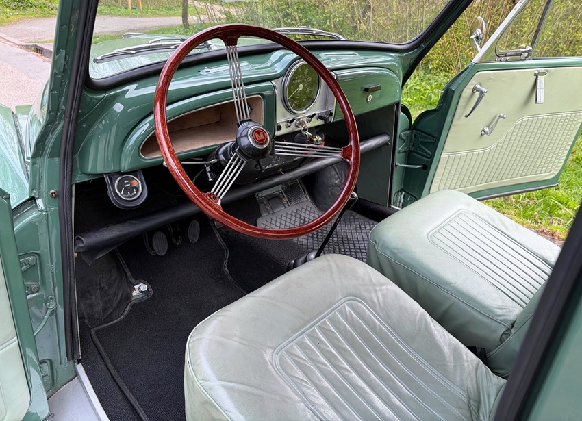 Ook het interieur is in een mooie staat. Het dashboard is voorzien van een dashboardkastje met klep (is niet meer te vinden) en een koelwater temperatuurmeter, dus je kan zien dat de motor perfect op temperatuur blijft. De dashboardverlichting is voorzien van LED lampjes, dus meer licht en beter zicht. Gewoon schitterend is het houten banjo stuur dat pas 1 jaar in de auto zit. Het originele stuur is ook aanwezig. De prachtige groene bekleding is origineel en nog steeds opvallend netjes. De hemelbekleding is vernieuwd en er zit een armsteun in het linkerportier.