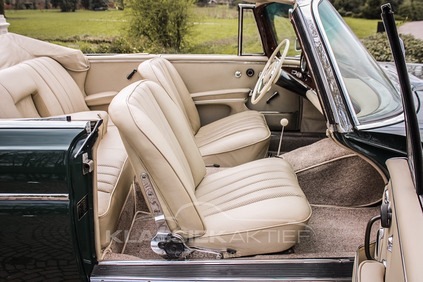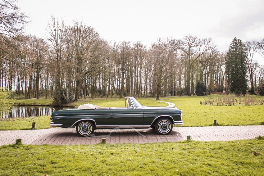 Deze indrukwekkende Mercedes-Benz 220 Se Cabriolet is in ultieme en perfecte conditie. Tijdens de uitgebreide restauratie is de auto in werkelijke nieuwstaat gebracht. De prachtige donkergroene kleur (kleurcode 268) is in perfecte conditie en heeft een stijlvolle en diepe glans. De chroom- en sierdelen zijn in uitmuntende conditie en dit is ook van toepassing op de verschillende rubberdelen en afwerkingen. De perfect passende wieldoppen vormen niet alleen een perfecte combinatie bij deze auto, maar zijn tevens in schitterende conditie. De indrukwekkende grille is ook in glanzende staat. Deze stijlvolle cabriolet is voorzien van een volledig nieuwe, groene cabrioletkap. In deze schitterende en perfecte conditie zien we ze niet vaak.