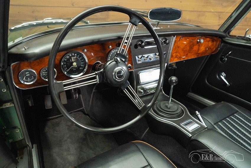 Austin-Healey 3000 MK3 in British Racing Green te koop Het uiterlijk van deze Austin Healey is uitgevoerd in het iconische British Racing Green lakwerk dat prachtig contrasteert met de vele chromen accenten en de klassieke chromen spaakwielen. De lijnen van de carrosserie komen hierdoor extra goed tot hun recht en geven de auto een elegante, sportieve uitstraling. De zwarte soft top sluit naadloos aan bij het geheel en maakt de auto zowel open als gesloten een lust voor het oog. Het interieur is uitgevoerd in stijlvol zwart en verkeert in een verzorgde staat, met comfortabele stoelen en een fraai houten dashboard dat perfect harmonieert met het exterieur. Alles samen vormt dit een klassiek Britse sportwagenbeleving pur sang, waarin stijl, comfort en rijplezier samenkomen.