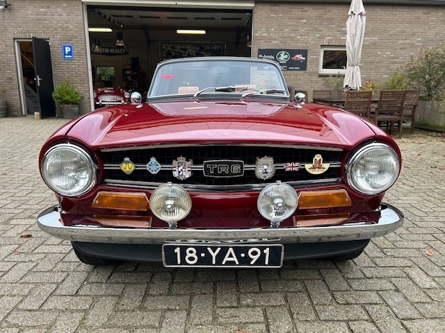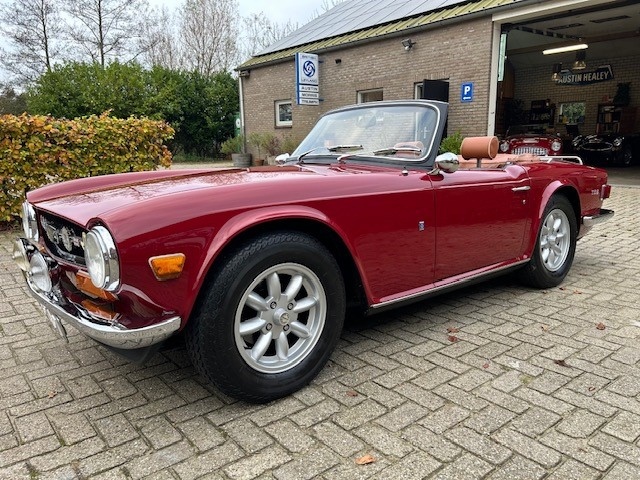 Werkelijk beeldschone Triumph TR6 van 1974 in Carmine red. Deze TR6 is in het verleden gerestaureerd en nog steeds in geweldige conditie. Zelden zien we een TR6 die zo netjes, zo strak is , fenomenaal. De Carmine rode kleur staat deze auto zo ongelofelijk goed. Het plaatwerk is strakker dan strak en vertoont geen enkel krasje of roest puntje . De motor en versnellingsbak zijn in perfecte staat en recent voorzien van nieuwe olie en filters. De motor loopt geweldig en de versnellingsbak schakelt fabrieksnieuw. De SU HS6 carburateurs zijn een upgrade en zijn geheel nagekeken .De auto is technisch in smetteloze staat. Alles werkt perfect . De TR is voorzien van 4 nieuwe Minilight wielen voor een extra sportieve look. Het interieur is gloednieuw, prachtige nieuwe met Tan kleurig leder beklede stoelen , matching deurpanelen en een Tan hoodcover. Werkelijk een plaatje .De softtop is gemaakt van zwart mohair , de duurste en mooiste soort, een wolsoort die perfect van vorm en kleur blijft . Een gloednieuw noten houten dashboard met gereviseerde tellers maakt deze cockpit mega klassiek. De auto heeft een klassiek houten Moto Lita stuur gemonteerd en een period correcte radio. Van onder is deze TR6 minstens net zo mooi, zeer netjes met een prachtig keihard en solide chassis. Zelden zien we de zo mooi, wie wil zorgeloos touren in deze prachtige 6 cylinder in lijn ?