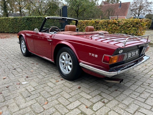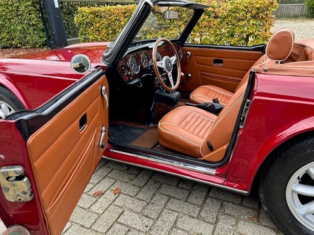 Truly beautiful Triumph TR6 from 1974 in Carmine red. This TR6 has been restored in the past and is still in great condition. We rarely see a TR6 that is so neat, so tight, phenomenal. The Carmine red color suits this car so incredibly well. The sheet metal is tighter than tight and shows no scratches or rust spots. The engine and gearbox are in perfect condition and recently provided with new oil and filters. The engine runs great and the gearbox shifts as it is factory new. The SU HS6 carburetor are an upgrade and have been completely checked. The car is technically in immaculate condition. Everything works perfectly. The TR is equipped with 4 new Minilight wheels for an extra sporty look. The interior is brand new, beautiful new seats upholstered in Tan leather, matching door panels and a Tan hood cover. The best available was used for this beauty. The soft top is made of black mohair, the most expensive and beautiful type, a type of wool that retains its shape and color perfectly. A brand new walnut dashboard with rebuild gauges makes this cockpit mega classic. The car has a classic wooden Moto Lita steering wheel mounted and a period correct radio. From under this TR6 is at least as beautiful, very neat with a beautiful rock-hard and solid chassis. Rarely do we see such a beautiful car . Who wants to tour carefree in this beautiful 6 cylinder in line?
