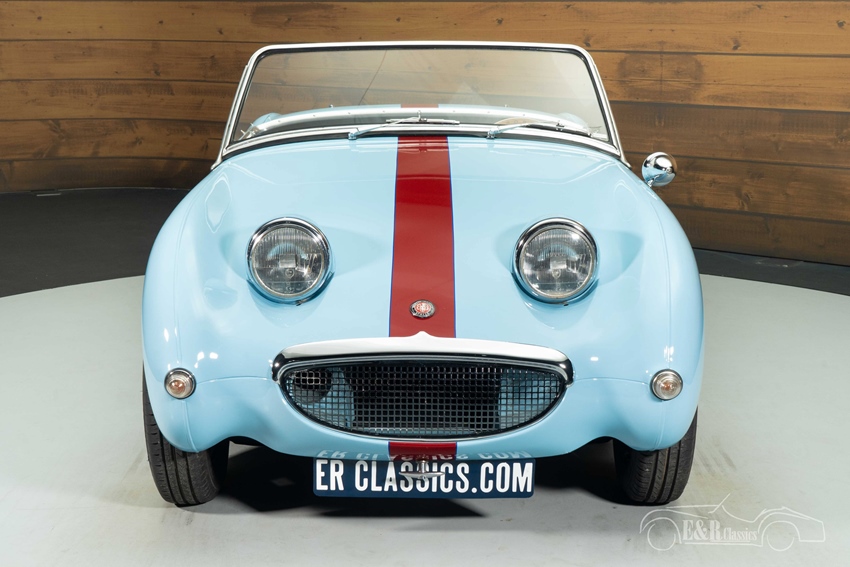 Lichtblauwe Austin-Healey Sprite Mk1 Frogeye te koop Ook optisch maakt deze Sprite een bijzonder sterke indruk. De lichtblauwe lak combineert fraai met de sportieve striping en sluit perfect aan bij het tijdloze ontwerp. De stalen velgen met originele uitstraling, sportuitlaat en correct gemonteerde accessoires versterken het klassieke geheel. Het interieur is verzorgd en stijlvol, met een fraai samenspel tussen het lakwerk en de bekleding. Het dashboard is uitgerust met drie extra Smiths-instrumenten voor olietemperatuur, voltmeter en klok, wat zowel functioneel als period-correct is. De auto wordt geleverd met soft top, tonneau cover én hardtop, waardoor hij geschikt is voor elk seizoen. Een zeer complete en rijk uitgeruste Frogeye, klaar voor zorgeloos rijplezier.