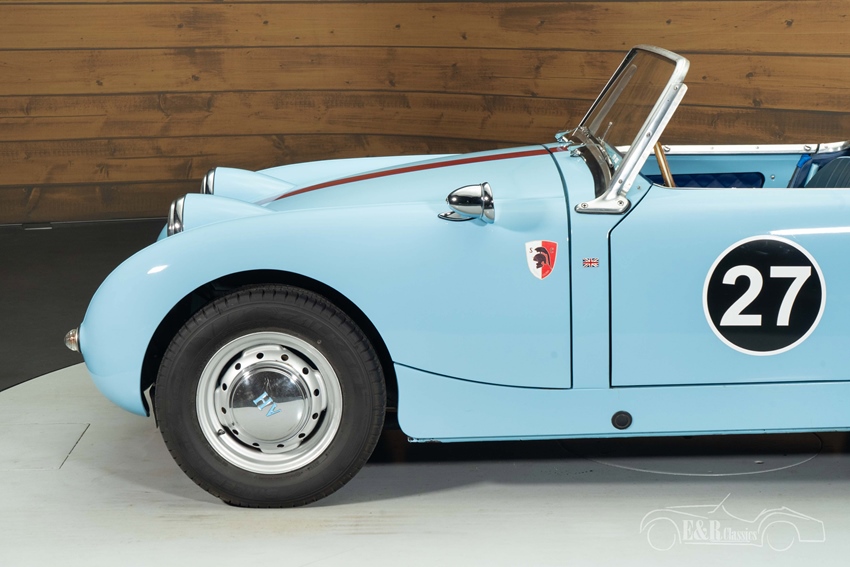 Lichtblauwe Austin-Healey Sprite Mk1 Frogeye te koop Ook optisch maakt deze Sprite een bijzonder sterke indruk. De lichtblauwe lak combineert fraai met de sportieve striping en sluit perfect aan bij het tijdloze ontwerp. De stalen velgen met originele uitstraling, sportuitlaat en correct gemonteerde accessoires versterken het klassieke geheel. Het interieur is verzorgd en stijlvol, met een fraai samenspel tussen het lakwerk en de bekleding. Het dashboard is uitgerust met drie extra Smiths-instrumenten voor olietemperatuur, voltmeter en klok, wat zowel functioneel als period-correct is. De auto wordt geleverd met soft top, tonneau cover én hardtop, waardoor hij geschikt is voor elk seizoen. Een zeer complete en rijk uitgeruste Frogeye, klaar voor zorgeloos rijplezier.