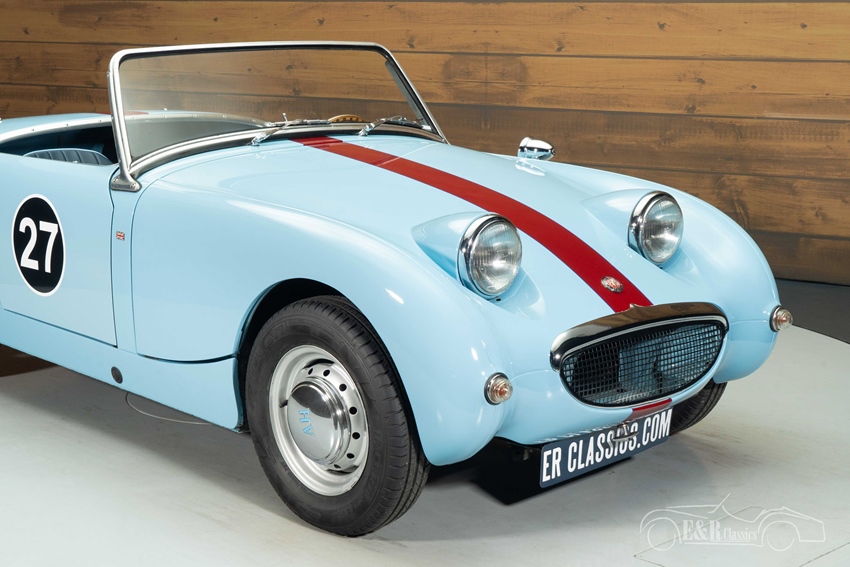 Lichtblauwe Austin-Healey Sprite Mk1 Frogeye te koop Ook optisch maakt deze Sprite een bijzonder sterke indruk. De lichtblauwe lak combineert fraai met de sportieve striping en sluit perfect aan bij het tijdloze ontwerp. De stalen velgen met originele uitstraling, sportuitlaat en correct gemonteerde accessoires versterken het klassieke geheel. Het interieur is verzorgd en stijlvol, met een fraai samenspel tussen het lakwerk en de bekleding. Het dashboard is uitgerust met drie extra Smiths-instrumenten voor olietemperatuur, voltmeter en klok, wat zowel functioneel als period-correct is. De auto wordt geleverd met soft top, tonneau cover én hardtop, waardoor hij geschikt is voor elk seizoen. Een zeer complete en rijk uitgeruste Frogeye, klaar voor zorgeloos rijplezier.