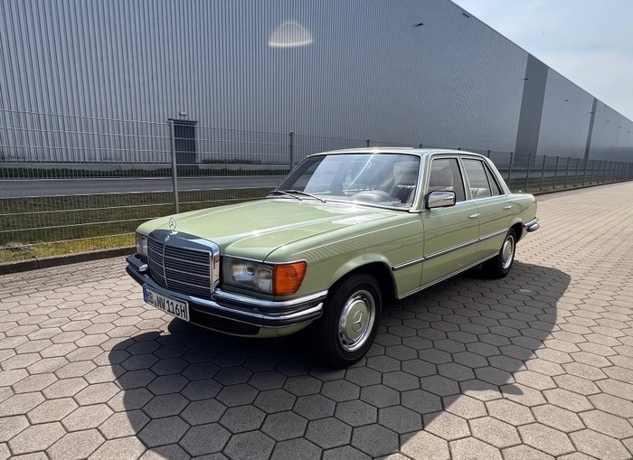 Prachtige Mercedes 280 S W116, bouwjaar 1977, te veilen. Het voertuig verkeert in originele staat en heeft slechts 100.000 km gelopen. Het heeft extra's zoals automatische transmissie, stuurbekrachtiging en een elektrisch stalen schuifdak, verwarmde achterruit, hoofdsteunen voor en veiligheidsgordels voor en achter, originele Becker-nadelstreifenradio met elektrische Hirschmann-antenne en een rechter buitenspiegel. De exterieurkleur in caledonisch groen harmonieert uitstekend met de groen-geruite stoffen bekleding. Het interieur is bijna nieuw en origineel; de bestuurdersstoel is een beetje versleten. Alle schakelaars enzovoort functioneren, net als de radio en de elektrische antenne. De carrosserie heeft slechts vliegroest en verkeert grotendeels in originele staat. Alleen de rechter voorspoiler is vervangen. Een paar jaar geleden zijn enkele deuken verwijderd en is het voertuig in 2023 door een vakbedrijf gedeeltelijk gelakt (beide zijden onder tot aan de sierlijst). Tot op kleine gebreken na is de lak erg goed. Technisch gezien is het voertuig erg goed; de motor verliest wat olie. De uitlaat rookt niet blauw e.d.; het olieverbruik is laag. De motor start zowel koud als heet goed. De banden zijn vrijwel nieuw; het zijn de goede Michelin-banden met een boordrand. Er is een nieuw uitlaatsysteem gemonteerd. Zichtbaar in Bremen, Duitsland.
