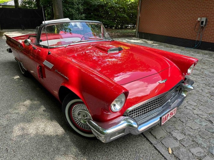 Voor de echte liefhebbers, hier is de kans om een uitstekende THUNDERBIRD in Uw bezit te hebben. Ze is origineel uit de fabriek gekomen in een witte kleur. De vorige eigenaar heeft de correcte rode FORD kleur aangebracht. In 1990 is ze door ons aangekocht in North Carolina USA. Steeds in een klimaat geregelde ruimte gestald en op regelmatige tijden aan lokale rally's en zomerritten deel genomen. In 2020 is er een restauratie gebeurd waarbij chassis en carrosserie grondig aangepakt werden. Ter gelijker tijd werden alle, door ouderdom, beschadigde delen vervangen. Vandaar de perfecte staat vandaag. Zoals op het chassis plaatje af te lezen is, werd deze gebouwd op 24 Juni 1957 en uitgeleverd met de 312 CI zware motor. Deze leverde 245 pk met de sportieve manuele 3 versnellingsbak. Om het interieur af te schermen tegen de zon, is een originele beschermhoes (zie foto's) bijgeleverd. Deze is héél eenvoudig aan te brengen en is bijzonder nuttig. De Thunderbird rijdt perfect en start probleemloos. De radio is afgekoppeld gezien geen bereik met M & L-golf frequentie. Een proefrit is altijd mogelijk alsook zijn alle foto's van de restauratie in te kijken. Graag afspraak via Catawiki