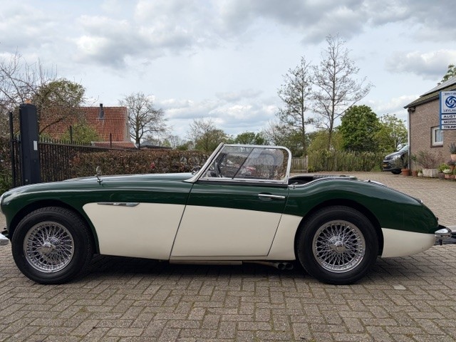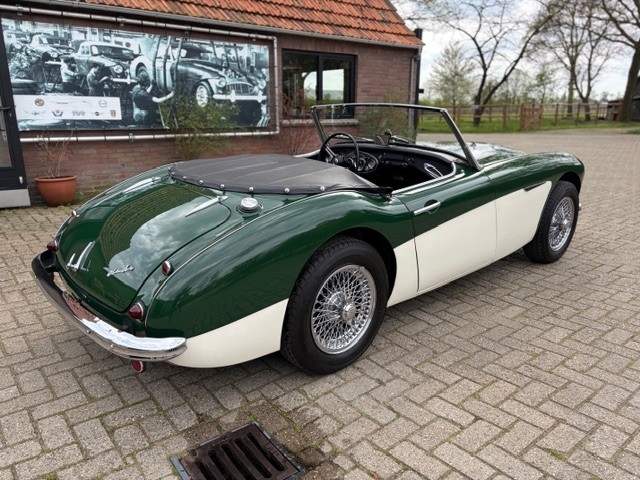 Over the past 3 years, various technical modifications have been made to improve reliability, such as a heavy-duty radiator, a rebuilt steering box, front disc brakes with dual-piston calipers, and the installation of a rebuilt 3.9 differential. The car sits on new Vredestein Sprint Classic tires all around, and the chassis has been fully treated with Dinitrol, so rust is no longer an issue. The 2600 engine has recently undergone extensive work; it has been completely overhauled, equipped with higher compression, the flywheel has been made 6 kilos lighter (giving it so much more punch), a fast road camshaft, spaghetti manifold, electronic ignition, modern screw-on oil filter, aluminum oil pan, high-torque Powerlite starter motor, and side exhaust. Very neat sidescreens are included, and the black vinyl soft top is nice and taut and closes perfectly. The cockpit can also be closed off with the supplied full tonneau cover. The interior is beautiful; the dashboard is fine and original, with all the correct, perfectly working gauges. The seats feature new foam and are upholstered in black leather. Most importantly, this Healey drives wonderfully, the strong 6-cylinder sounds fantastic, and the overdrive gearbox works flawlessly. It is rightfully an iconic British sports car: beautiful design, a powerful inline 6 engine with an amazing sound, and pure style. Especially in this beautiful two-tone color with chrome wire wheels, it is a rare and beautiful sight.