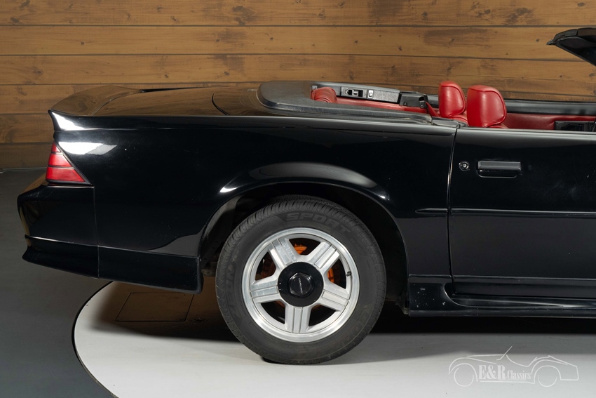 Zwarte Chevrolet Camaro RS Cabriolet te koop Ook optisch is deze Camaro RS een blikvanger. De diepzwarte lak sluit prachtig aan op de sportieve fabrieks-bodykit en de iconische vijfspaaks velgen, waardoor de auto een breed en gespierd silhouet krijgt. De zwarte soft-top past perfect binnen het geheel, maar het is vooral het volledig rode interieur dat deze auto uitzonderlijk karakter geeft. De rode bekleding, het bijpassende tapijt en de contrasterende zwarte dashboardaccenten vormen samen een uitgesproken en zeer sfeervolle combinatie. Een stijlvol en compleet geheel dat typerend is voor de flamboyante Amerikaanse cabrio's uit deze periode.