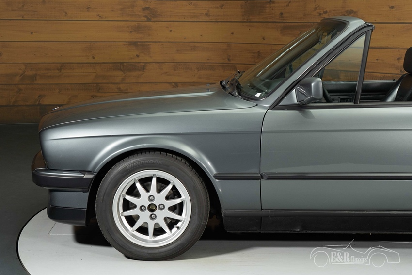 BMW 320i E30 Cabriolet in antraciet te koop Het exterieur is uitgevoerd in stijlvol antracietkleurig lakwerk, wat prachtig contrasteert met de zwarte soft top en de klassieke lijnen van de carrosserie. De tijdloze vormgeving wordt versterkt door de lichtmetalen velgen, die perfect passen bij het karakter van de auto. Het interieur is voorzien van een zwart lederen bekleding, die een mooie patina toont en bijdraagt aan de authentieke uitstraling. Het samenspel tussen het donkere exterieur en het zwarte interieur zorgt voor een chique en sportieve uitstraling, geheel in lijn met waar BMW in deze periode voor stond.