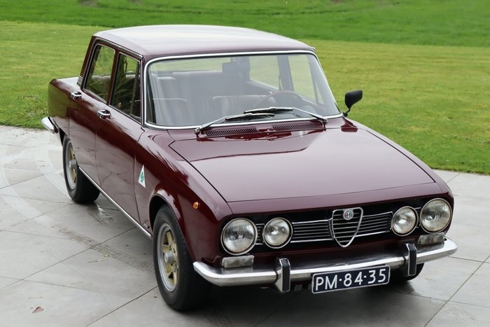 Alfa Romeo Berlina 1750 - Zeldzaam - 1750 motor (meest begeerde motor met 114 pk) - Uitgevoerd in schitterende rode kleur 'Maroon' - Algehele nette staat - Uitvoerig onderhoud gehad in het afgelopen jaar - Nieuwe Koni schokbrekers EXTERIEUR Het lakwerk is opnieuw gespoten in 2022 en sindsdien goed bewaard gebleven en slechts enkele gebruikerssporen. Het zou goed zijn om het lakwerk nog een keer te laten polijsten voor een diepere glans. De stervelgen zijn vervaardigd uit Aluminium en bevinden zich nog in goede staat. De carrosserie heeft goede passingen van naden en is roest- en schadevrij. Ook de rubbers zijn gaaf en de verlichting is fris. Al met al een algemene nette staat, zeker gezien de leeftijd van de auto. INTERIEUR Ook het maroon lederen interieur is een waar kunstwerk en verkeert in zeer nette staat. Het interieur beschikt over fraaie tellers en een houten dashboard dat nog heel mooi is. De auto laat zich besturen door het fraaie houten 3-spaaks stuurwiel. Het interieur heeft normale gebruikersporen en verkeert in algehele nette staat. Alle tellers zijn werkend. De Alfa beschikt over verwarming en gordels. De kofferruimte is verrassend ruim en verkeert eveneens in een nette staat. Keurig afgedekt onder de koffermat bevindt zich het reservewiel. TECHNISCH De Berlina is zorgvuldig en met passie onderhouden, veelal door Alfa Romeo specialisten. In 2022 zijn het achterste gedeelte van de uitlaat vervangen door RVS. Ook zijn de voor- en het midden gedeelte van de uitlaat vernieuwd. Tevens alle 4 schokdempers. (Koni) Ook is de cardanas gereviseerd en zijn lagers en keerringen vervangen. De motorruimte ziet er verzorgd en droog uit. De 4-cilinder is 1779 cc groot, levert 114pk en beschikt over dubbele carburateurs. De handgeschakelde versnellingsbak zorgt tezamen met achterwielaandrijving voor een ultieme rijervaring. De auto start, rijdt en schakelt goed.