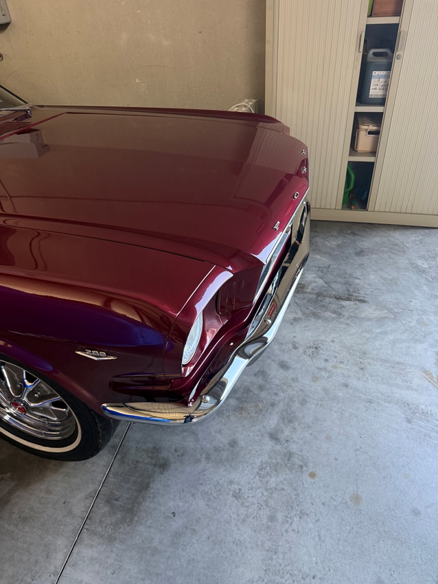 Ford Mustang convertible 289 V8 met het iconische kleur Candy Apple Red.