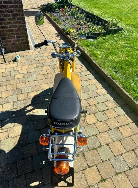 Deze iconische minibike werd volledig gerestaureerd met originele Honda-onderdelen, met oog voor detail en respect voor de originele look. De combinatie van het frisse geel met witte accenten geeft hem een echte retro uitstraling.