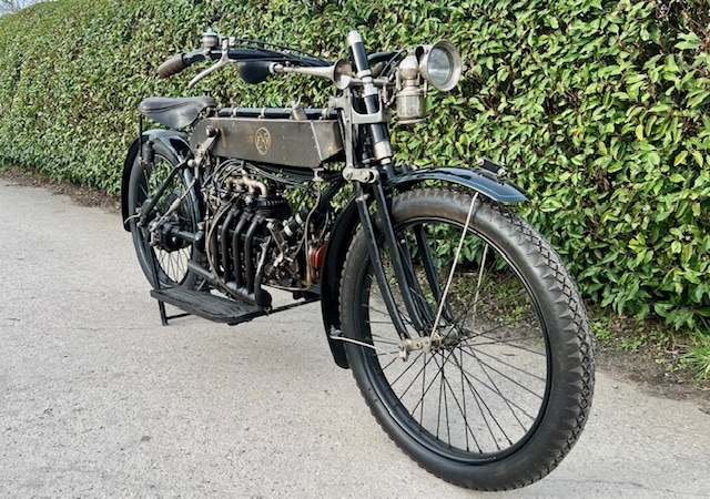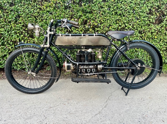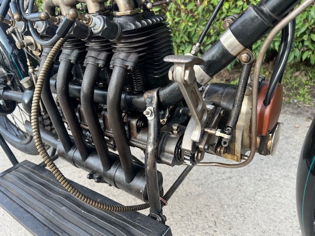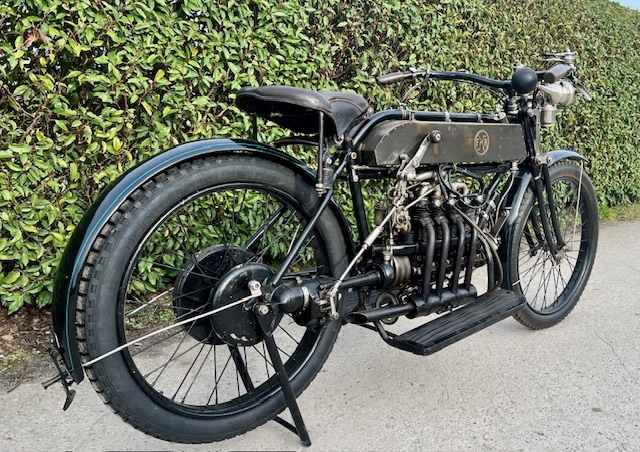 Belgische FN 4 cilinder 500cc van 1913. Zeldzaam model met kickstarter vooraan. Dit model heeft al de koppeling en een 2 versnellingsbak op de kardan aandrijving.Oudere restauratie maar alles origineel. Als optie heeft deze een ventilator die aangedreven is met een kabel en aandrijfwiel dat tegen het vliegwiel loopt.