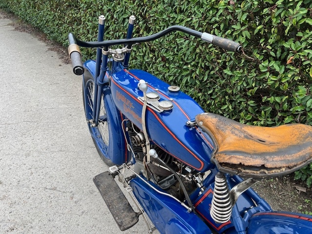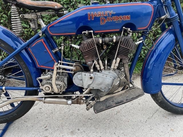 Gerestaureerde Harley model 1918. Dit is een ex legermotorfiets van WOI, zie de USA markings op zadel en blok. Motorfiets is enkele jaren geleden gerestaureerd en heeft 2 x de Tour de Provence mee gereden probleemloos.
