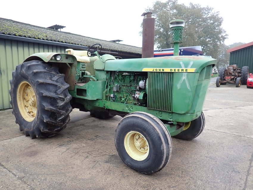 For sale is this 1965 John Deere 5010 diesel tractor. The tractor is in running and driving condition as can be seen on our you tube channel. Doesn't shift into low gear for the moment. The tractor is equipped with the famous 8.7 litre 6 cylinder engine coupled to an 8 speed forward 2 reverse syncro range gearbox. It is equipped with 3 point linkage and has the heavy 1000 pounds wheel weights inside the rear wheels. With the big round fenders covering the 24.5-32 tires and the fat front rubber it could become the pride and joy in any John Deere tractor collection.