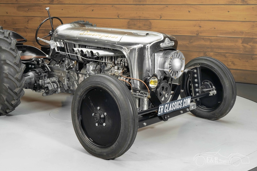 Zeldzame Lamborghini Centenario Tractor te koop Qua afwerking is deze Lamborghini Centenario een waar kunstwerk. De gepolijste aluminium carrosserie schittert in het licht en benadrukt het ambachtelijke karakter van de machine. De dubbele stoelen met handgemaakte lederinzet en het minimalistische dashboard zorgen voor een pure, industriële uitstraling die zowel stijlvol als functioneel is. Elk detail ademt vakmanschap, van de zorgvuldig afgewerkte motoronderdelen tot de solide stalen wielen – een perfecte samensmelting van verleden en heden, techniek en design.